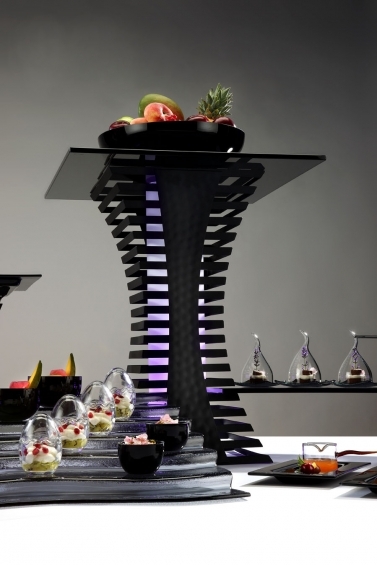 Auf die unterschiedlich hohen Säulen können auf eine Seite große Buffetplatten gelegt werden, die anderen dienen mit den passenden Rippen zur Stabilisation. Sie sind aus massivem Edelstahl (18/10) gefertigt und quadratisch. Zudem können sie mit der Linie "Squareline" kombiniert werden.